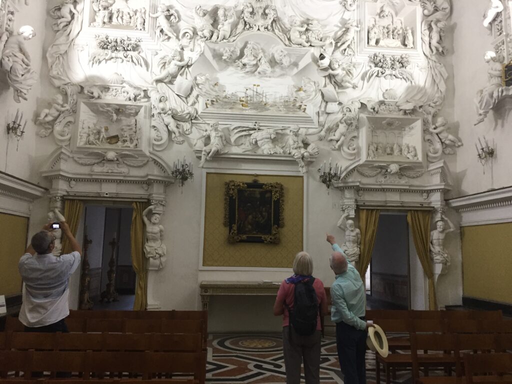 Moving on we visit the Oratorio of Santa Cita. In this ‘oratorio’, a private chapel constructed in the 16th century, you will find sumptuous rococo stucco sculptures decorating the interior. The quality and detail of the sculptural elements are a wonderful surprise to many who visit here. This chapel really is a masterpiece of craftmanship.